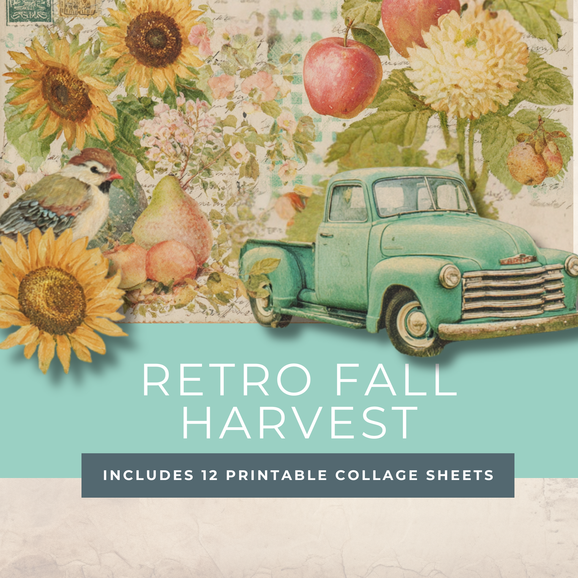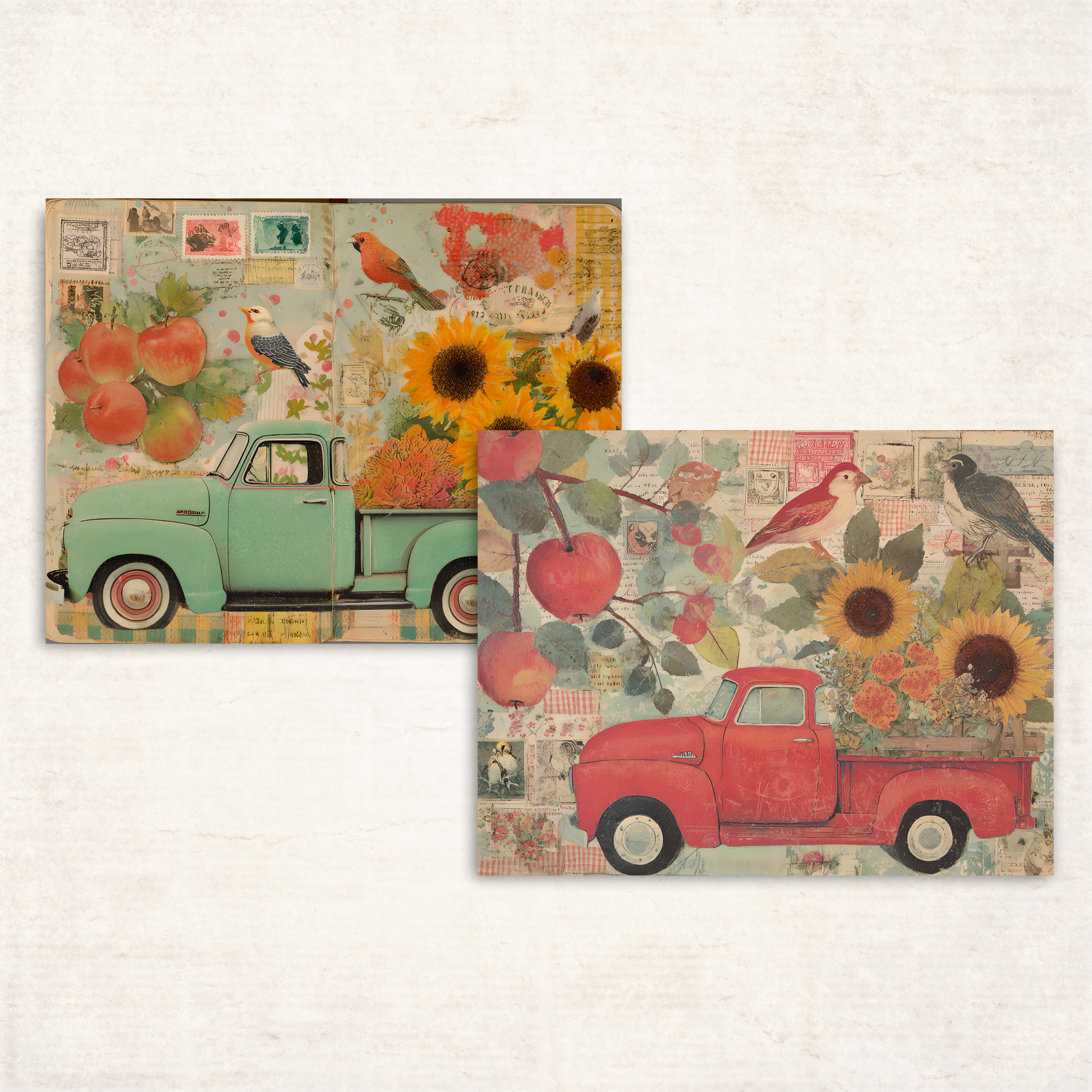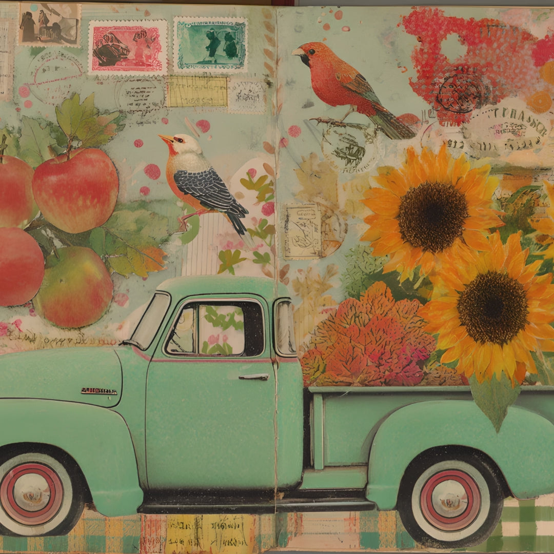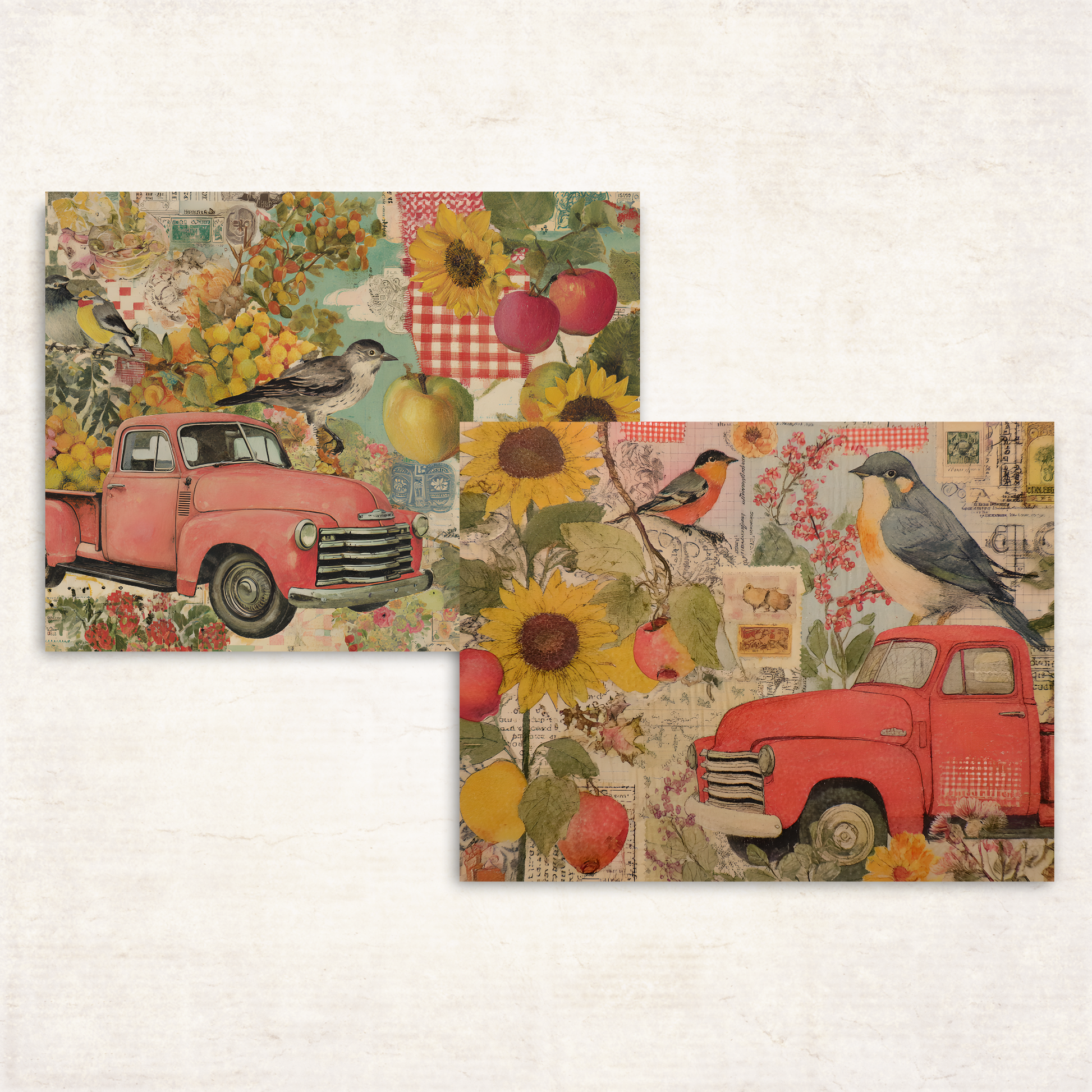 Fall Harvest Collage Sheets – Printable Retro Pickup Trucks, Apples, Sunflowers & Birds for Junk Journals