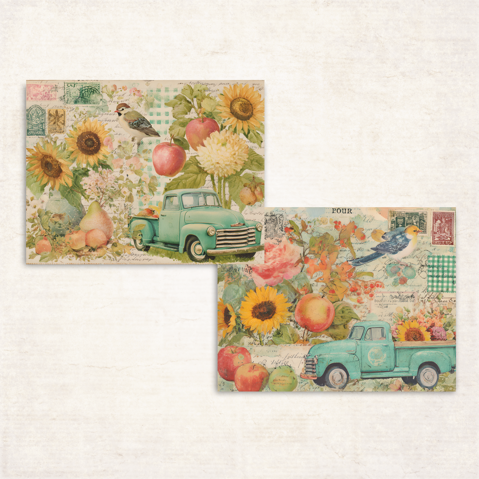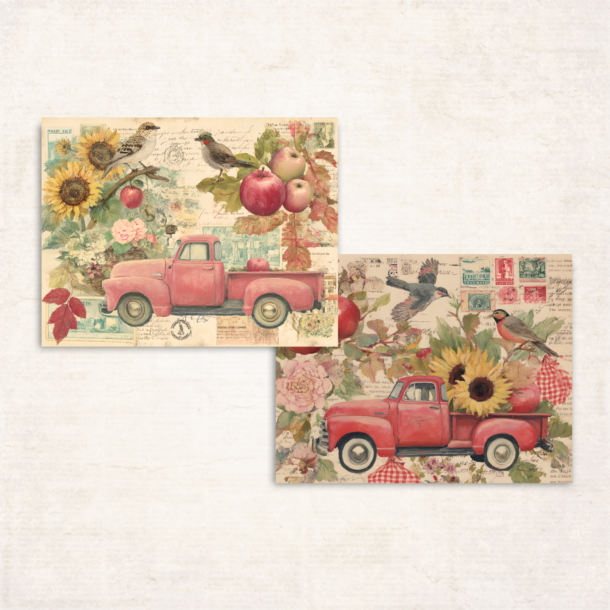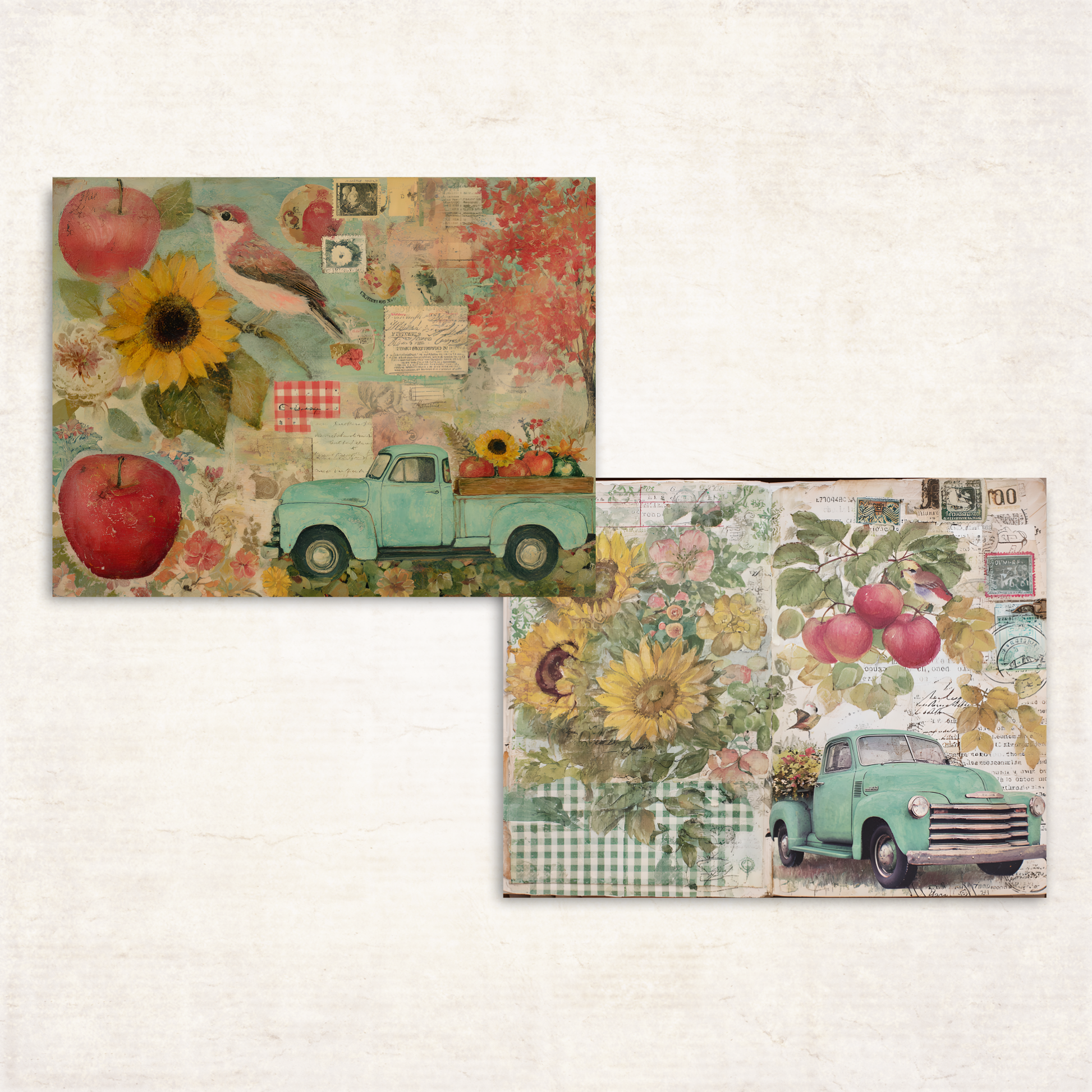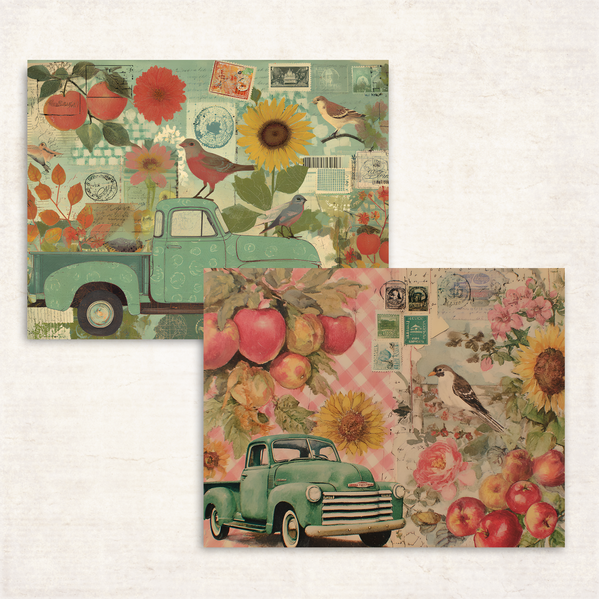 Fall Harvest Collage Sheets – Printable Retro Pickup Trucks, Apples, Sunflowers & Birds for Junk Journals